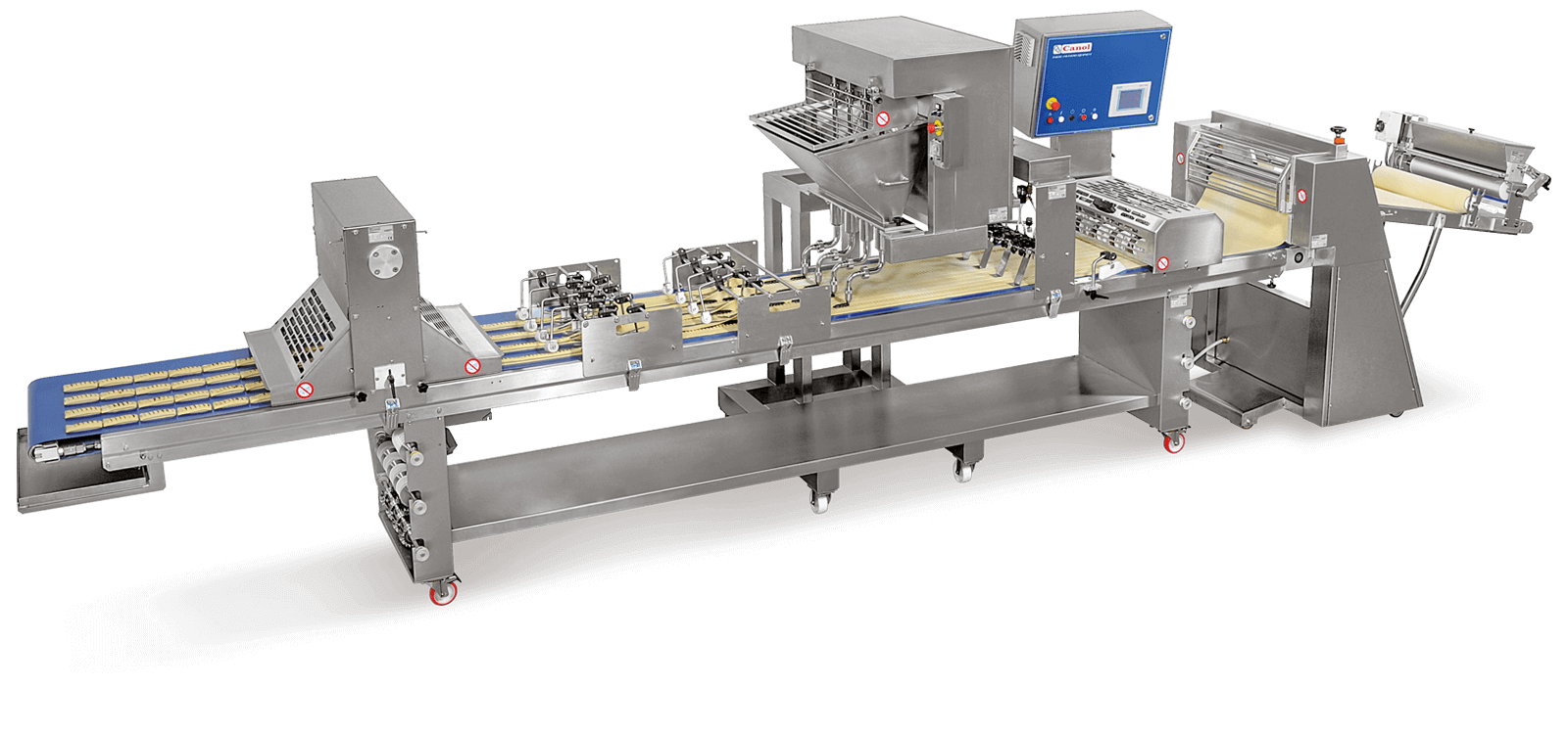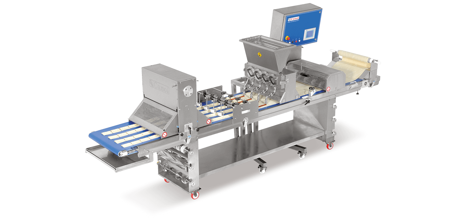 The Canolino make-up table is PLC-controlled and features a touchscreen interface, enabling operators to store and recall programs and parameters for efficient management of multiple production functions.