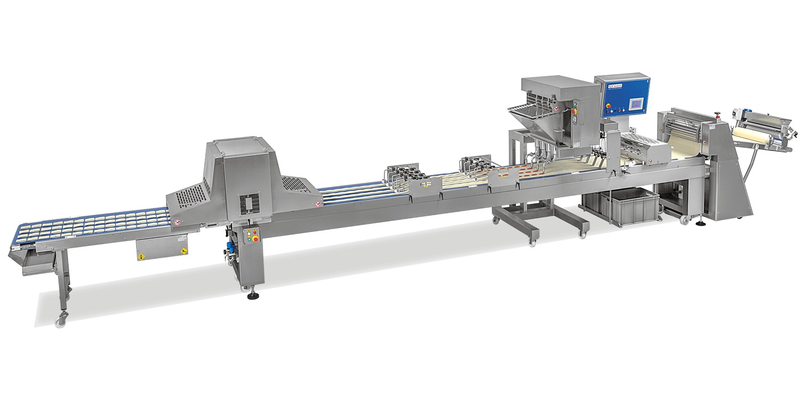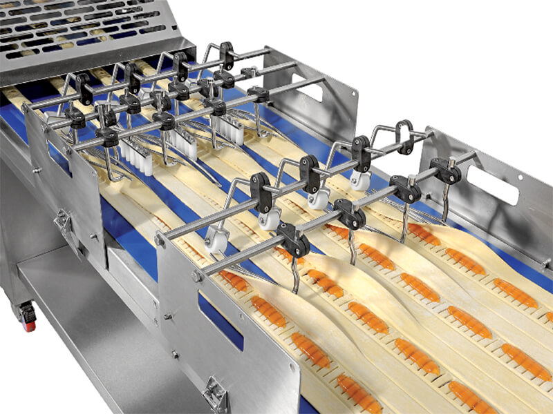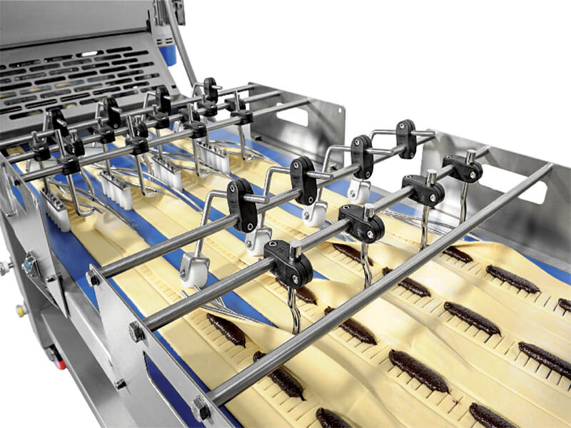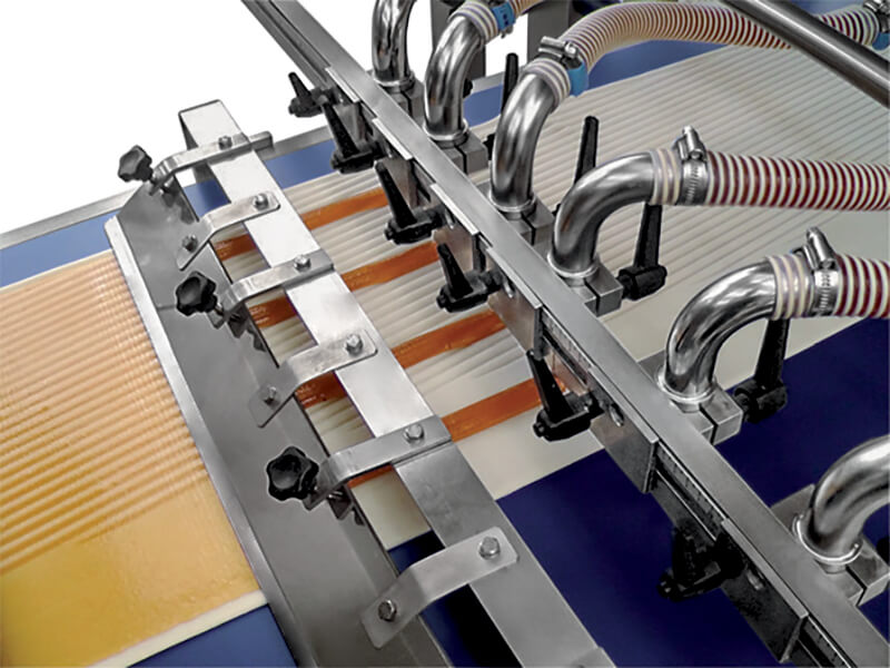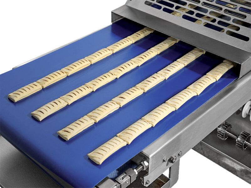 It can be equipped with an electric guillotine, which can be positioned anywhere along the conveyor to suit production needs. The guillotine supports both straight cutting blades and a variety of cutting dies.